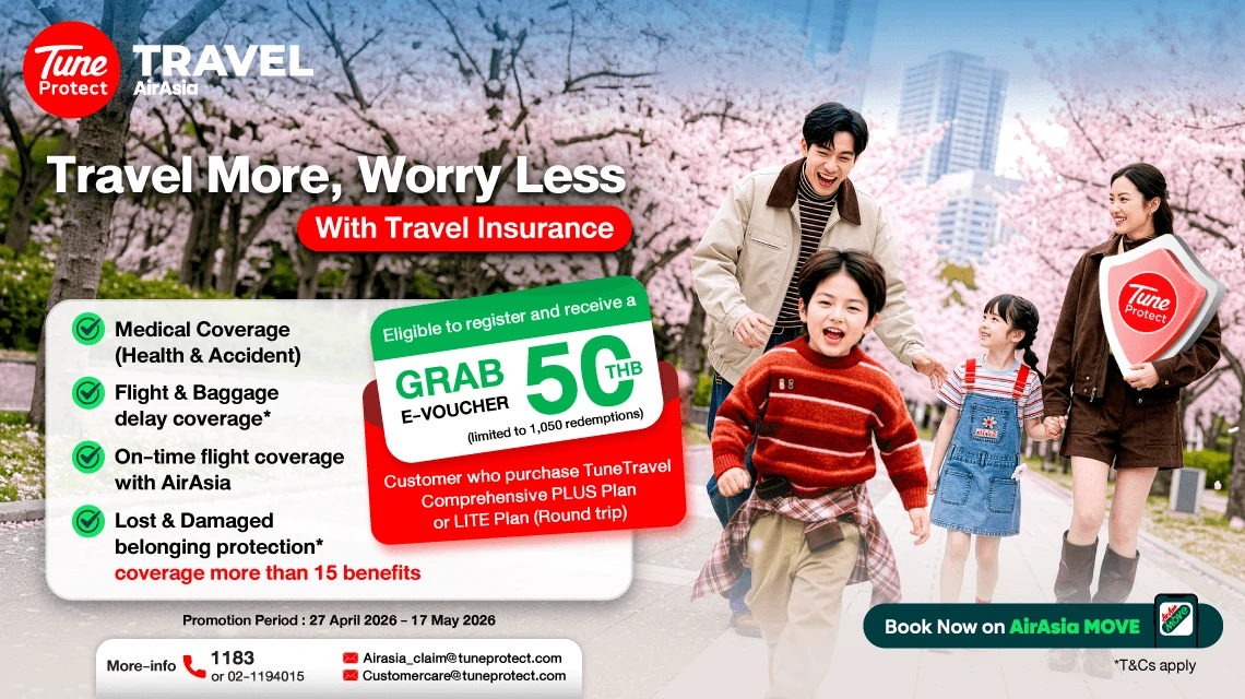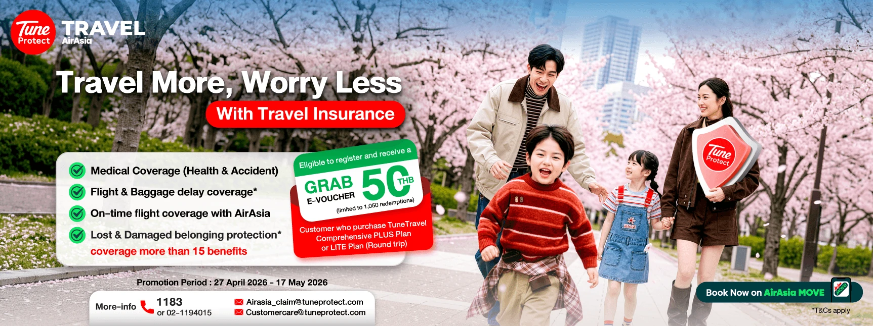 Plan your trip smarter and get more value! When you book round-trip AirAsia flights on MOVE and purchase travel insurance, receive a Grab e-Voucher worth 50 THB.