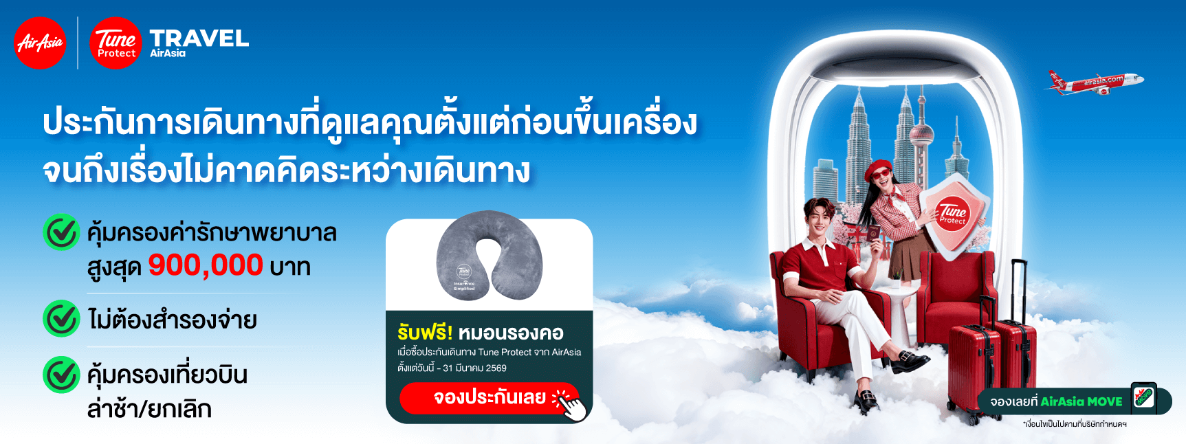 เพียงคลิกเลือกประกันภัยการเดินทาง Comprehensive PLUS plan หรือ LITE plan ทั้งรายเที่ยว หรือรายปี ครอบคลุมทั้งเที่ยวบินในประเทศและระหว่างประเทศ เมื่อจองเที่ยวบินบน AirAsia MOVE รับหมอนรองคอ มูลค่า 165 บาท จำกัด 250 ท่านแรกที่ลงทะเบียน